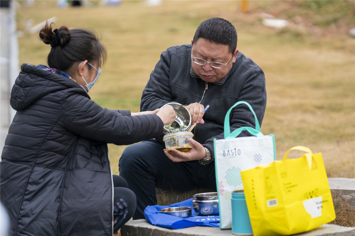 1月26日中午,田東波坐在水泥板上吃妻子帶來的午飯,十來分鐘的吃飯、交談過后,田東波馬上回醫(yī)院上班。清遠日報全媒體記者 李思靖 攝