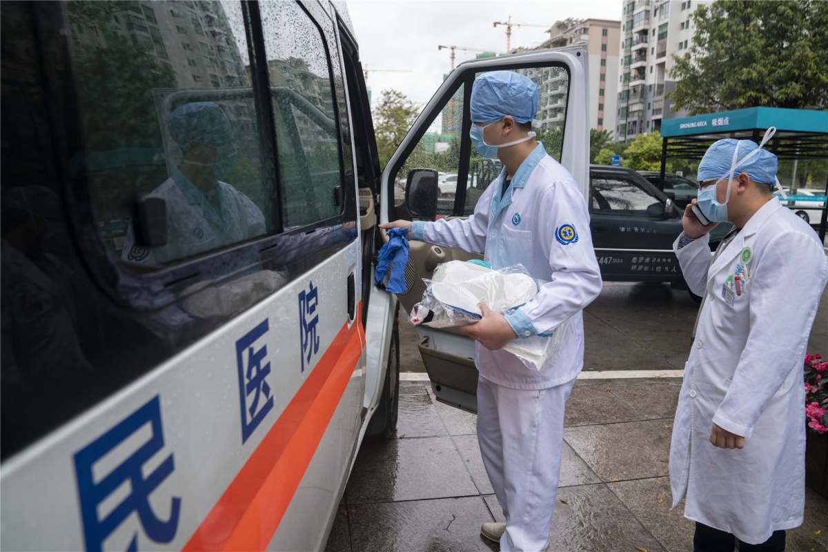 1月26日,市人醫(yī)發(fā)熱門診醫(yī)護人員接過就醫(yī)人員的探熱棒。清遠日報全媒體記者 李思靖 攝