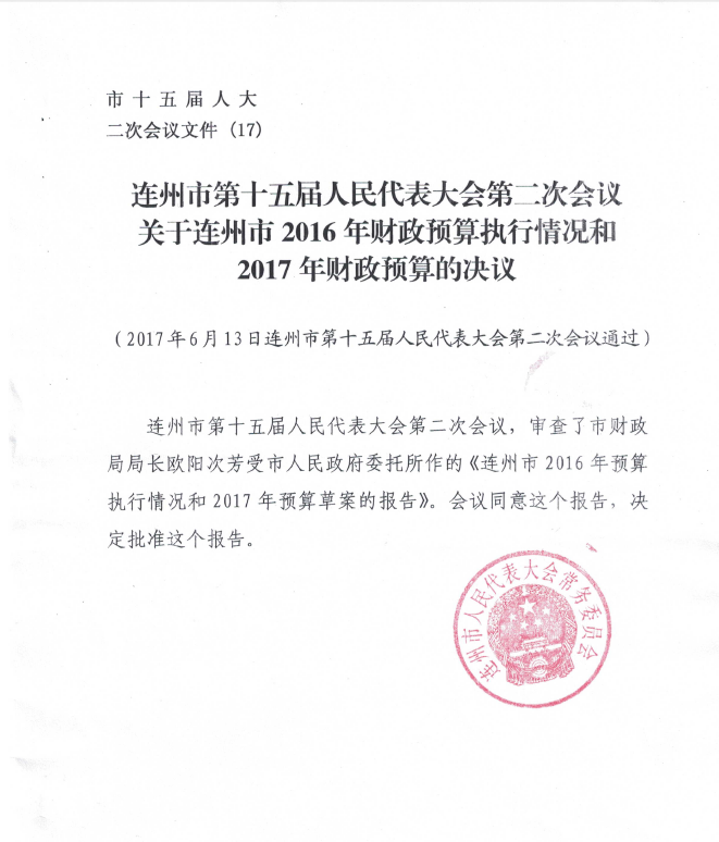 關(guān)于連州市2016年財(cái)政預(yù)算執(zhí)行情況和2017年財(cái)政預(yù)算的決議