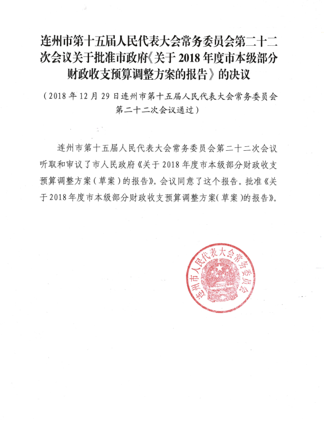 連州市第十五屆人民代表大會(huì)常務(wù)委員會(huì)第二十二次會(huì)議關(guān)于批準(zhǔn)市政府《關(guān)于2018年度市本級(jí)部分財(cái)政收支預(yù)算調(diào)整方案的報(bào)告》的決議