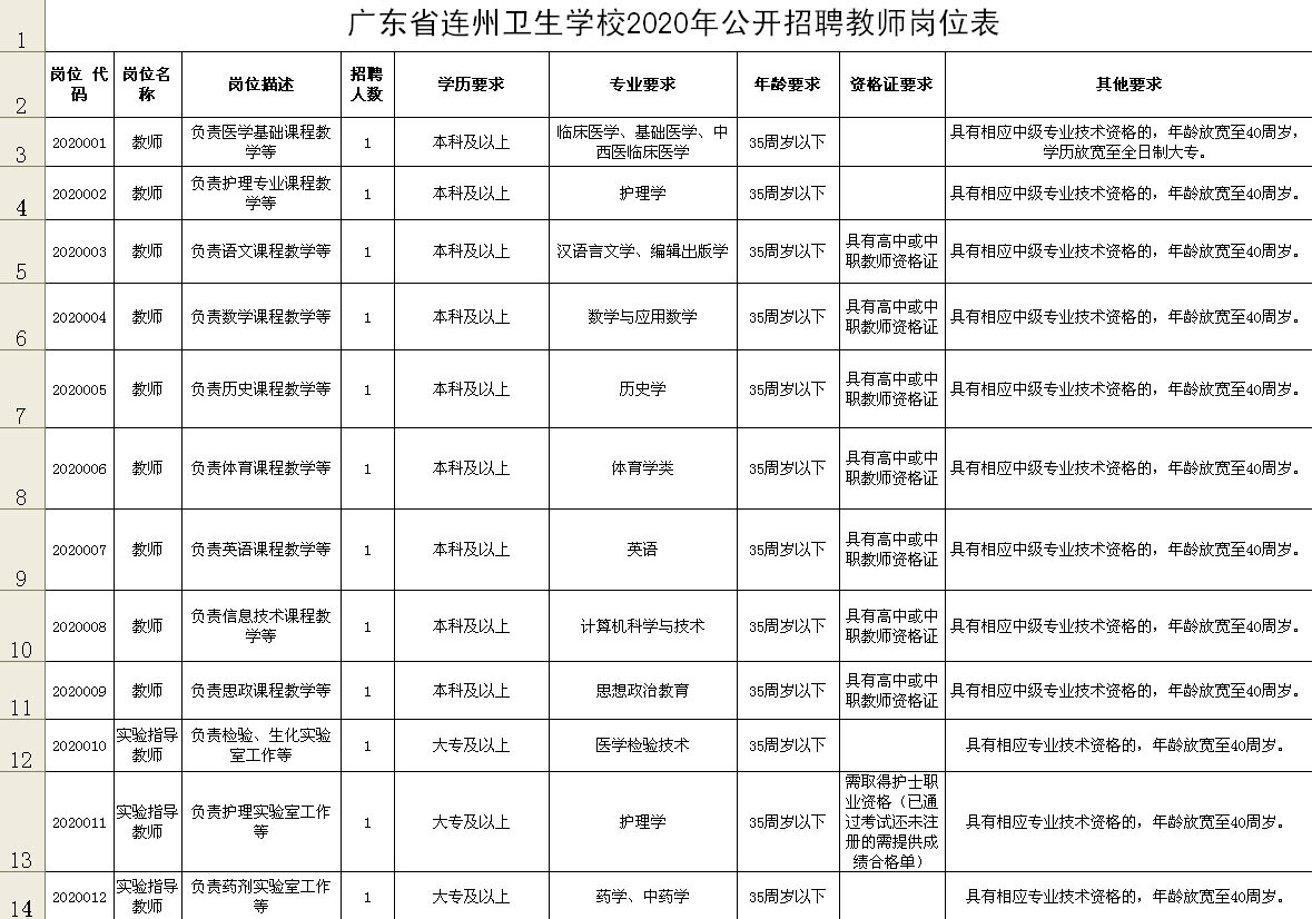 1.《廣東省連州衛(wèi)生學(xué)校2020年公開招聘教師崗位表》