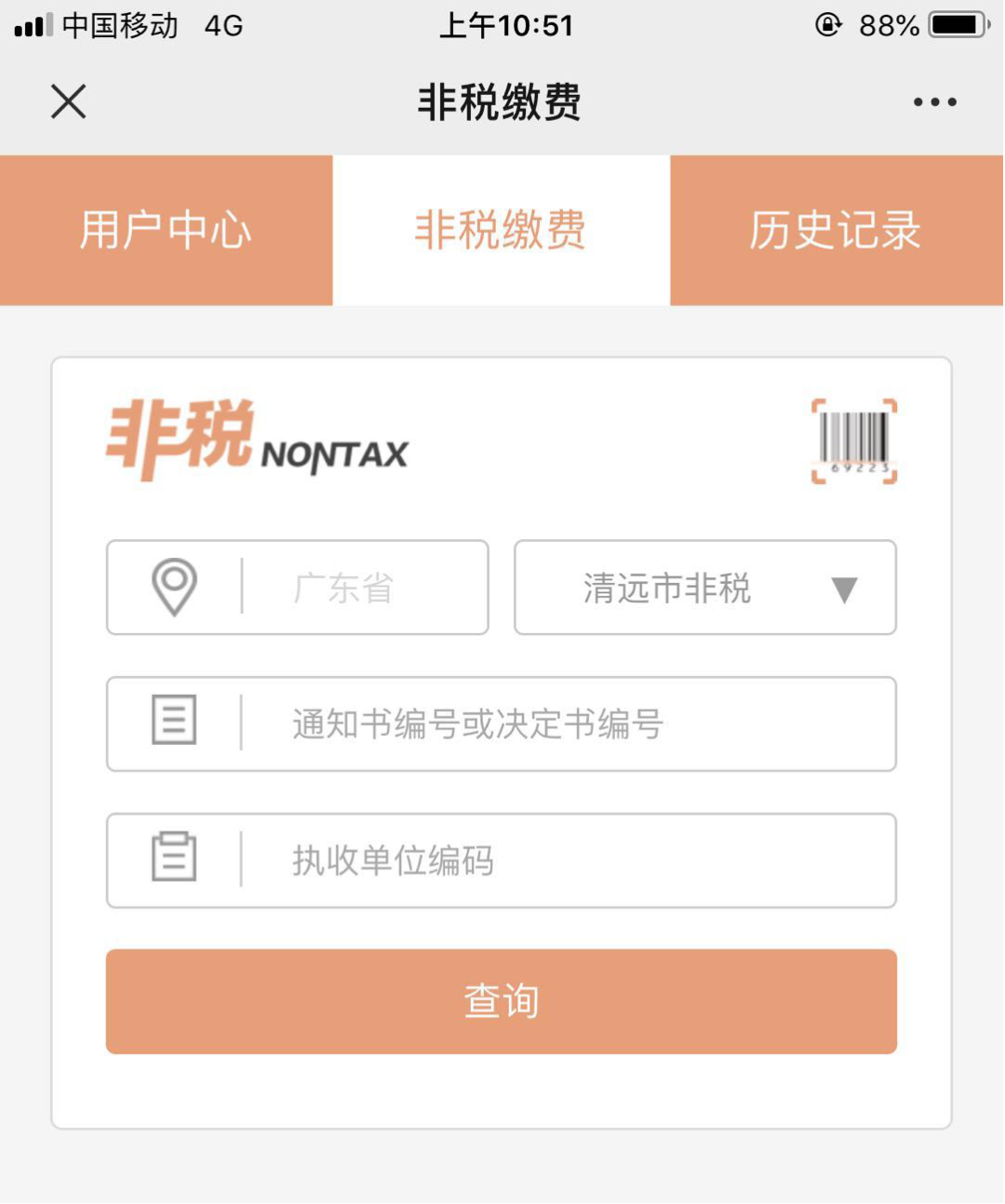2、進入繳費查詢頁面后,選擇廣東省清遠市非稅,對應(yīng)輸入繳費單的通知書編號、執(zhí)收單位編碼,點擊“查詢”。