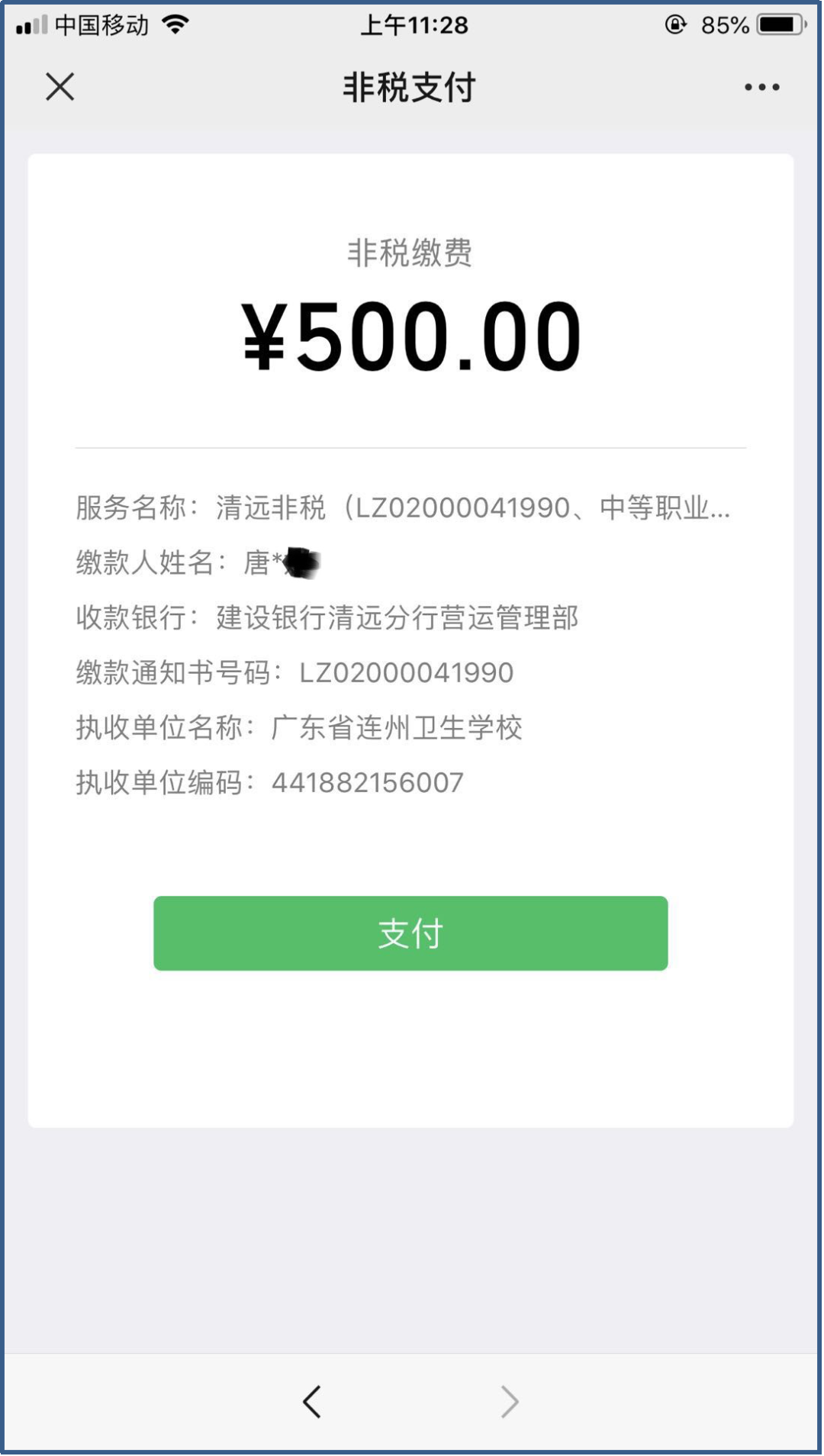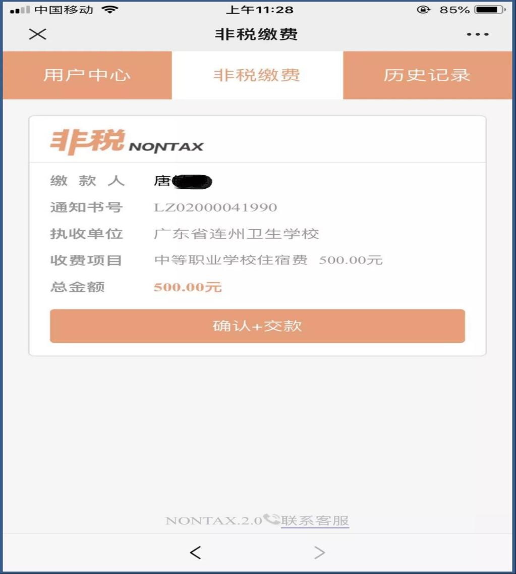 3、系統(tǒng)自動返顯通過省級財政非稅系統(tǒng)查詢到的繳費明細信息,核對信息后點擊“確認+繳款”,核對金額無誤后點擊“支付”輸入微信支付密碼(可用微信零錢及微信綁定銀行卡付款),完成繳費后系統(tǒng)顯示交易結(jié)果。