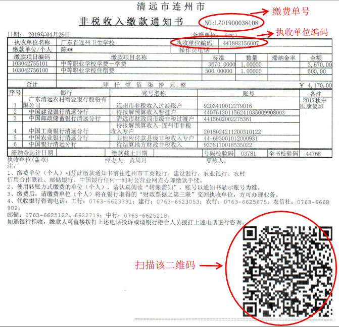 注意:對應(yīng)繳費通知書號(LZ***********(開頭兩個字母是大寫和執(zhí)收單位編碼(441882156007)(這兩個號碼在繳費單的右上方)