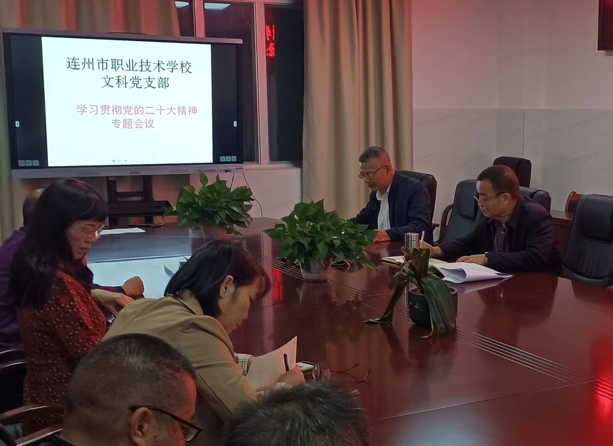 11月15日,連州市職業(yè)技術(shù)學(xué)校文科黨支部在辦公樓506會(huì)議室召開全體黨員會(huì)議,會(huì)議主題為宣講黨的二十大精神。由支部書記張勤同志主持會(huì)議。
