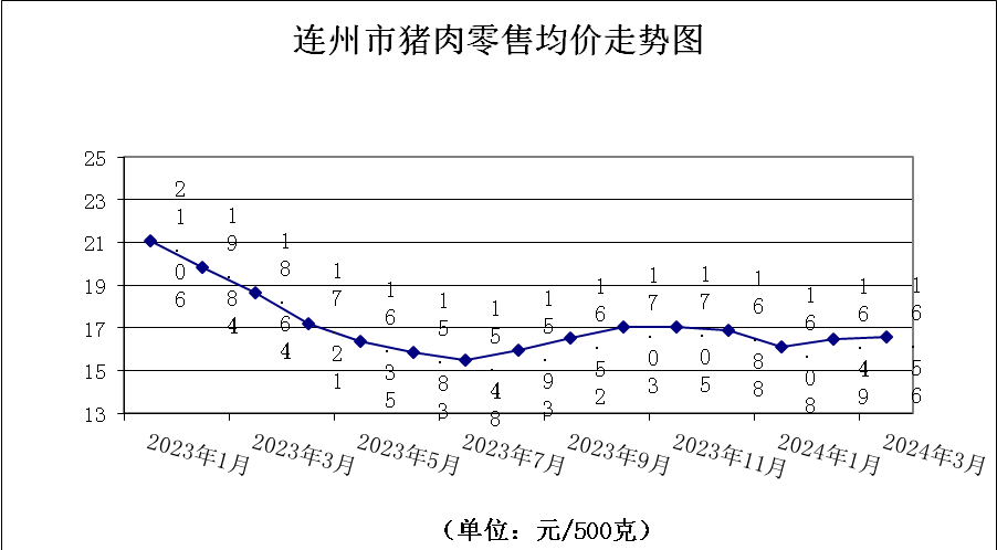 3月份,我市豬肉零售價格升幅收窄,豬肉價格微升。農(nóng)貿(mào)市場監(jiān)測的四種主要豬肉零售均價為16.56元/500克,環(huán)比升0.42%。其中,排骨20.24元/500克,環(huán)比降1.41%;精瘦肉17.00元/500克,環(huán)比升1.13%;肋條肉14.50元/500克,環(huán)比升1.33%,有皮上肉14.50元/500克,環(huán)比升1.33%。