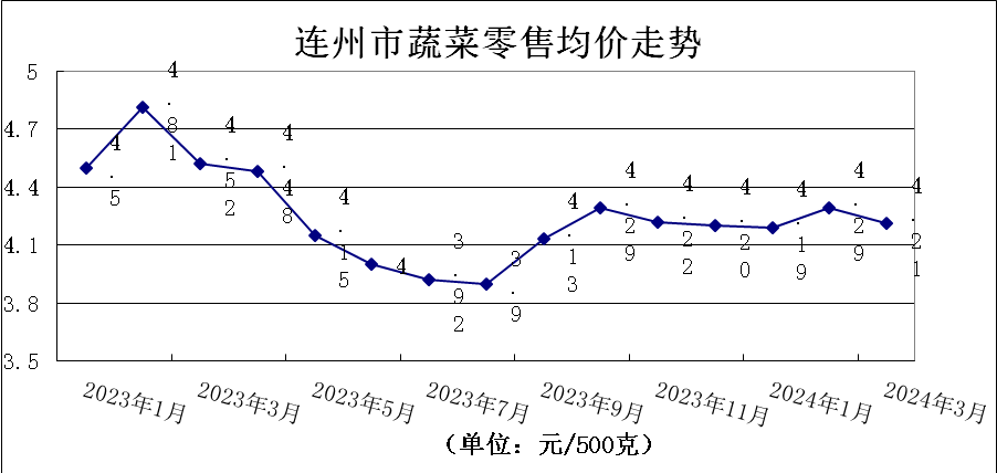 3月份,我市蔬菜零售價格小幅下降。農(nóng)貿(mào)市場監(jiān)測的30種主要蔬菜零售價格“7升7平16降”,蔬菜類平均零售價格為4.21元/500克,環(huán)比降1.86%。其中,葉菜類零售價格為4.05元/500克,環(huán)比降3.80%,花菜類零售價格為3.68元/500克,環(huán)比升1.66%,瓜菜類零售價格為4.44元/500克,環(huán)比降0.22%,根莖類零售價格為4.41元/500克,環(huán)比降1.34%。