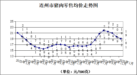 1月份,我市豬肉零售價格持續(xù)下降。農(nóng)貿(mào)市場監(jiān)測的四種主要豬肉零售均價為19.01元/500克,環(huán)比降3.60%。其中,排骨24.56元/500克,環(huán)比降6.40%;精瘦肉20.50元/500克,環(huán)比降3.35%;肋條肉15.50元/500克,環(huán)比降1.34%,有皮上肉15.50元/500克,環(huán)比降1.34%。