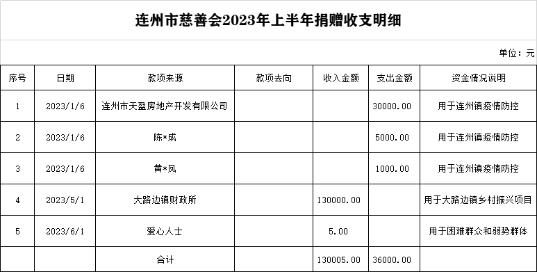 關(guān)于連州市慈善會(huì)2023年上半年捐贈(zèng)收支明細(xì)的公示