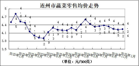1月份,我市蔬菜價(jià)格止跌微升。農(nóng)貿(mào)市場(chǎng)監(jiān)測(cè)的30種主要蔬菜零售價(jià)格“1389,蔬菜類平均零售價(jià)格為4.24/500克,環(huán)比升0.47%。其中,葉菜類零售價(jià)格為4.08/500克,環(huán)比降2.16%,花菜類零售價(jià)格為3.88/500克,環(huán)比升3.47%,瓜菜類零售價(jià)格為4.43/500克,環(huán)比升3.26%,根莖類零售價(jià)格為4.39/500克,環(huán)比升0.46%