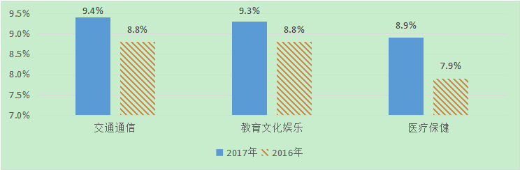 圖2:2016-2017年醫(yī)療保健、教育文化娛樂和交通通信消費(fèi)占比情況