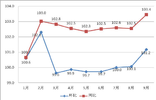 從各月環(huán)比指數(shù)看,前三季度連州CPI“5漲4降”,除2月份受春節(jié)因素影響CPI 上漲2.3%,9月份受臺風(fēng)和國家政策調(diào)整導(dǎo)致食品和教育服務(wù)等價格上漲,影響CPI上漲1.2個百分點外,其余月份漲跌幅均未超過0.7個百分點。