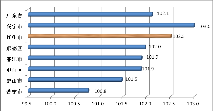 前三季度,連州CPI累計同比漲幅大,全省排位靠前:前三季度,廣東省居民消費價格總水平同比上漲2.1%,連州高于全省0.4個百分點。在全省排位中,興寧市(上漲3.0%)位列第一,深圳市(上漲2.6%)位居第二,連州市(上漲2.5%)與東莞市(上漲2.5%)并列第三。與省內(nèi)部分縣級城市比較(CPI按高到低排序),在全省7個縣級城市中,連州市累計同比上漲2.5%,漲幅較大、排位靠前(見圖2)。
