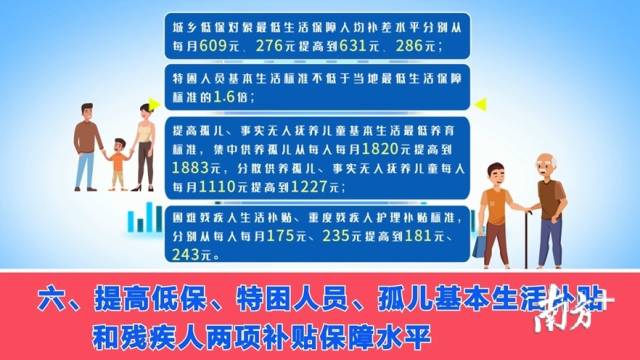 六、提高低保、特困人員、孤兒基本生活補(bǔ)貼和殘疾人兩項(xiàng)補(bǔ)貼保障水平。城鄉(xiāng)低保對(duì)象最低生活保障人均補(bǔ)差水平分別從每月609元、276元提高到631元、286元;特困人員基本生活標(biāo)準(zhǔn)不低于當(dāng)?shù)刈畹蜕畋U蠘?biāo)準(zhǔn)的1.6倍;提高孤兒、事實(shí)無人撫養(yǎng)兒童基本生活最低養(yǎng)育標(biāo)準(zhǔn),集中供養(yǎng)孤兒從每人每月1820元提高到1883元,分散供養(yǎng)孤兒、事實(shí)無人撫養(yǎng)兒童從每人每月1110元提高到1227元;困難殘疾人生活補(bǔ)貼、重度殘疾人護(hù)理補(bǔ)貼標(biāo)準(zhǔn),分別從每人每月175元、235元提高到181元、243元。(主管部門:市民政局)