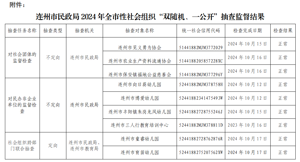 2024年,連州市民政局根據(jù)《國務(wù)院關(guān)于在市場(chǎng)監(jiān)管領(lǐng)域全面推行部門聯(lián)合“雙隨機(jī)、一公開”監(jiān)管的意見》(國發(fā)〔2019〕5號(hào))、《廣東省行政檢查辦法》和《廣東省市場(chǎng)監(jiān)督管理局關(guān)于印發(fā)廣東省市場(chǎng)監(jiān)管領(lǐng)域部門聯(lián)合‘雙隨機(jī)、一公開’抽查工作指引的通知》(粵市監(jiān)信監(jiān)〔2023〕16號(hào))要求,抽取了監(jiān)管對(duì)象和執(zhí)法人員名單,開展了雙隨機(jī)抽查工作?,F(xiàn)將抽查監(jiān)督結(jié)果向社會(huì)公布: