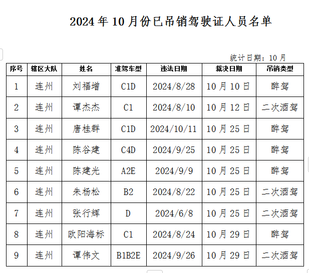 2024年10月被吊銷駕駛證的駕駛?cè)嗣麊?/span>曝光