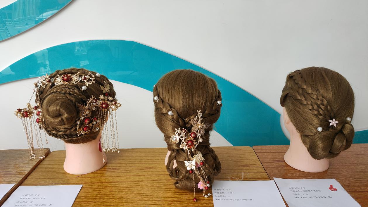 在美容產(chǎn)業(yè)學院里,開展美甲競賽和盤發(fā)競賽,同學們經(jīng)過創(chuàng)意設(shè)計,完成了甲面彩繪、立體雕花等作品,并結(jié)合傳統(tǒng)盤發(fā)技藝與現(xiàn)代造型理念,完成古風發(fā)髻、晚宴發(fā)型等作品,同時還開展了美甲、頭模和美容禮儀展示,充分展示產(chǎn)教融合的建設(shè)成果。